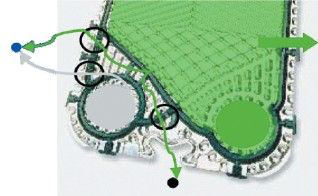 雷曼可拆式板式換熱器采用了精確的多點定位系統。角孔直徑100mm以下型號的四角定位系統,讓板片以上下導桿為軸心精確嵌合在一起。角孔直徑150mm以上型號的五點定位系統,讓板片的定位是以多個金屬與金屬接觸點而確定,其中上導桿的接觸點,可以防止板片上下移動,下導桿的接觸點可限制板片不會左右移動。采用多點定位技術,讓板片組既可以在導桿上沒有阻力的前后移動,輕松簡單的完成維護作業,又可以在復裝時讓板片精確嵌合,讓墊片密封準確,絲毫不差,板片組達到完全復位,從而保證了換熱器拆裝后壽命也耐久。而且具有多點定位系統的板式換熱器只需要一個人,即使沒有任何經驗,用簡單的工具就可輕易的拆裝換熱器。